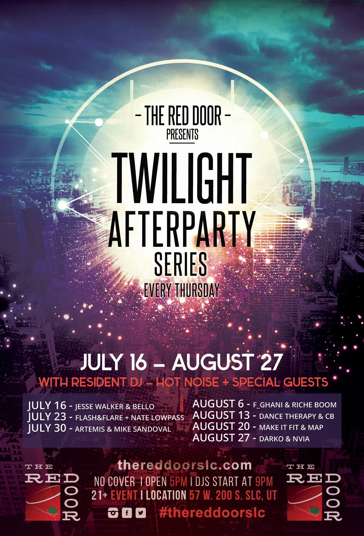 After the success of last years afterparties, The Twilight Afterparty Series is returning to the Red Door with another banger lineup of Salt Lake City's best DJ's. Join us each Thursdays throughout the month of July and August.
