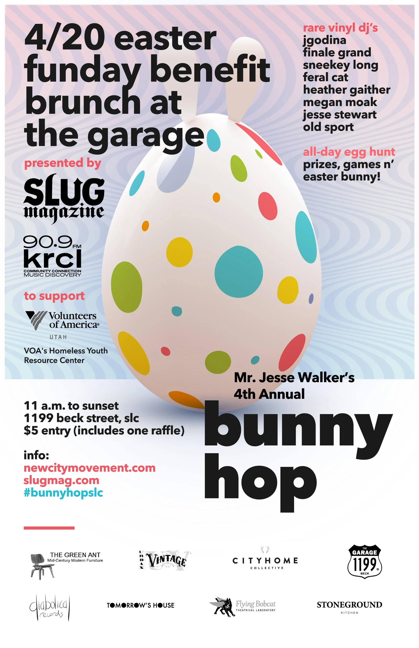 SALT LAKE CITY, UT – March 20, 2014 – On Sunday, April 20th, The Garage on Beck Street will host Jesse Walker’s 4th Annual ‘Bunny Hop,’ which includes DJ’s playing vinyl records, a charity raffle and a surprise visit from the Easter Bunny! Great prizes, an all-day egg hunt, games and a special drinks-and-brunch menu will be part of the festivities.