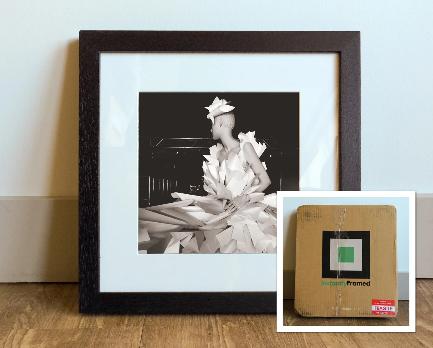 Just upload any photo (or file) from your phone to the Instantly Framed app. From there, I.F. prints it on photo luster paper using archival inks and frame it in a beautiful USA made FSC certified black walnut frame with recycled backing materials. The whole process takes less than 5 business days. Pretty cool no?